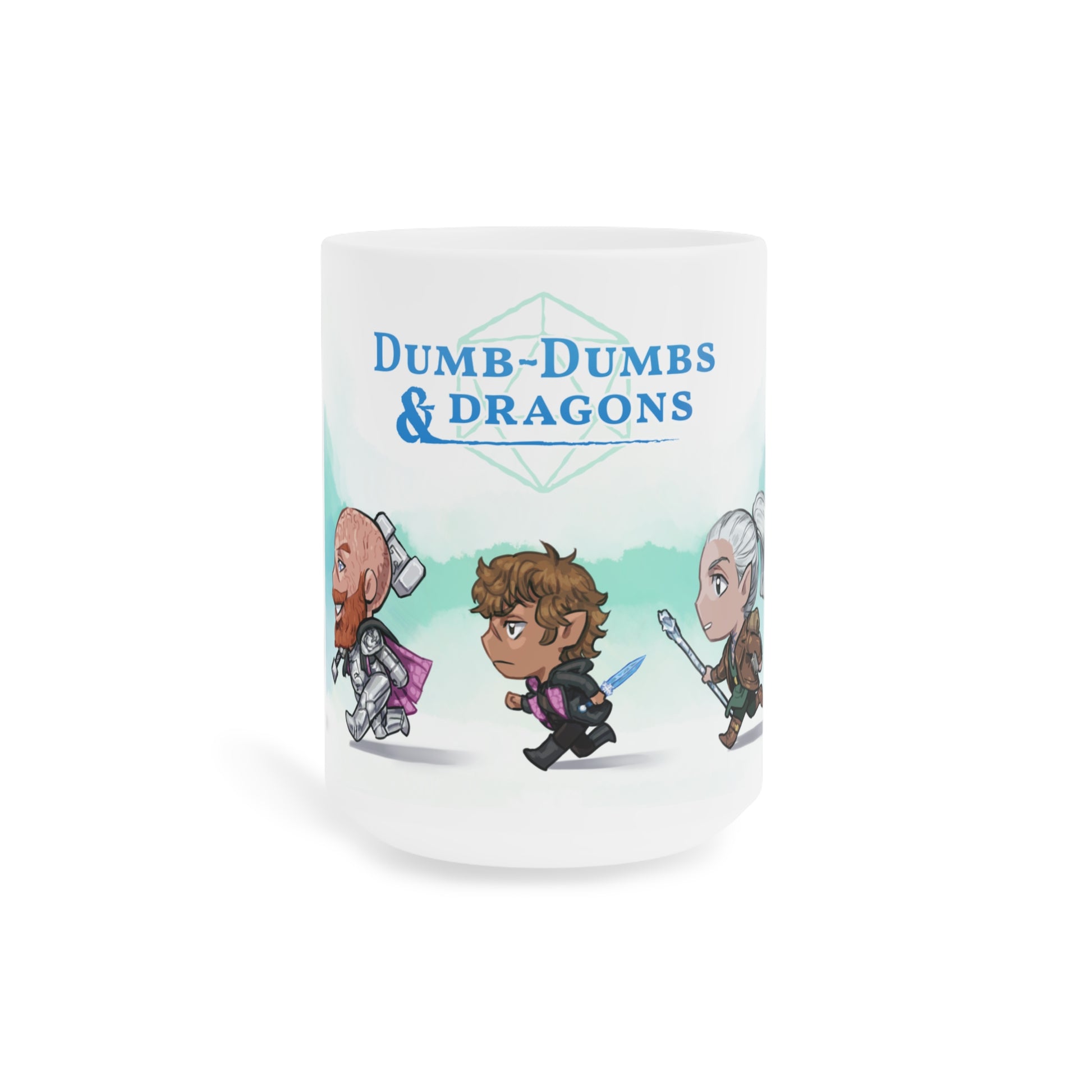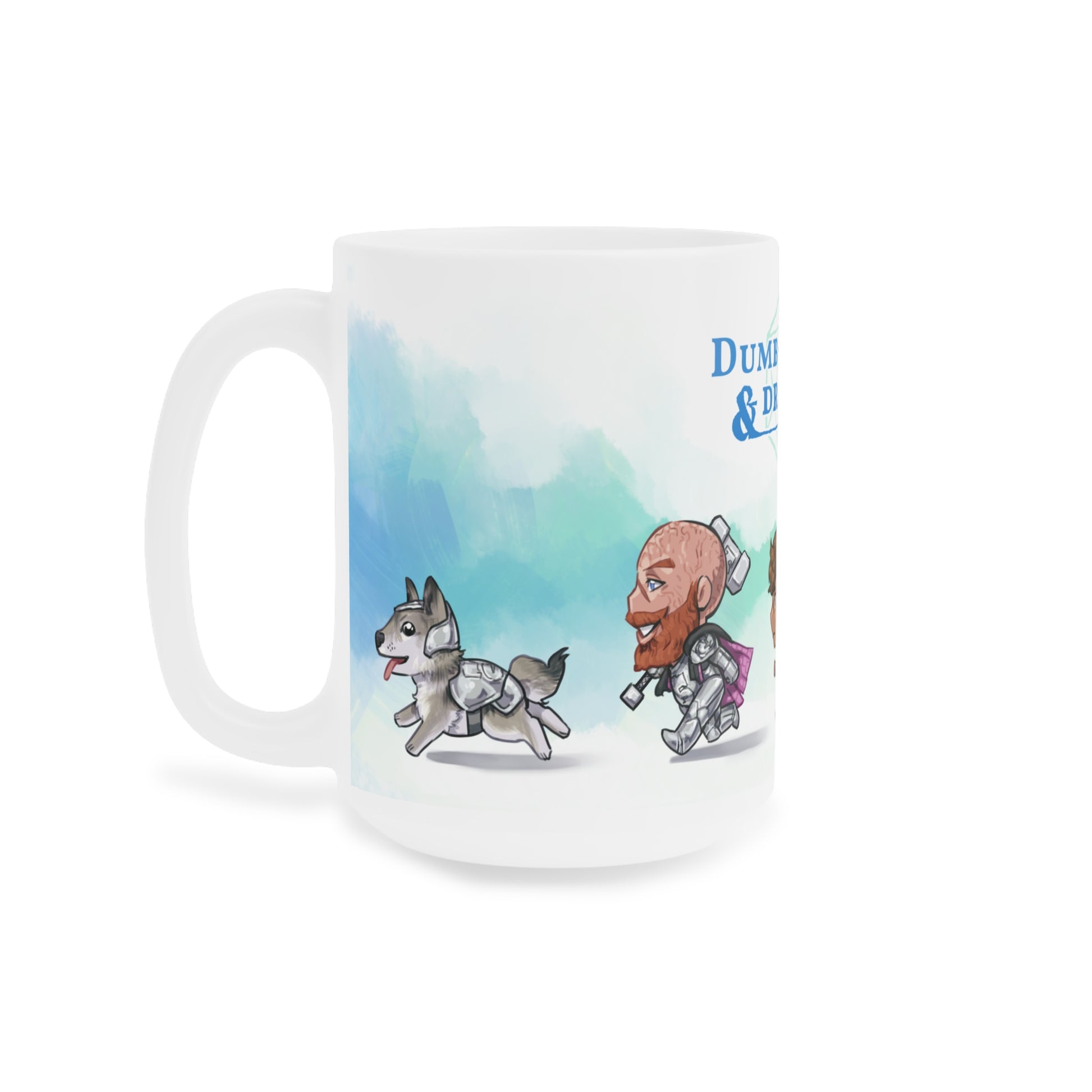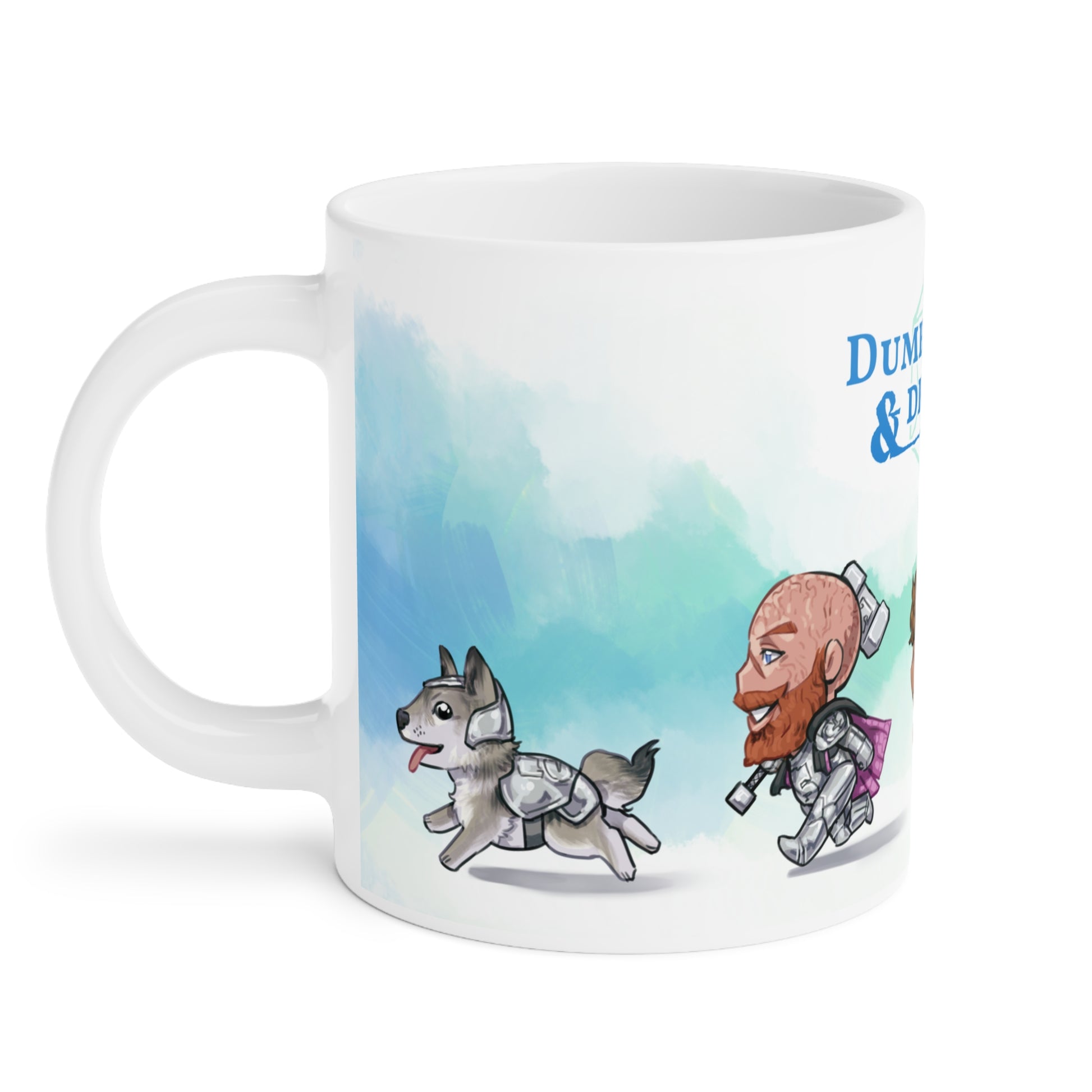 The original crew of Dumb-Dumbs & Dragons + Bucky! Here in cute chibi form running off to their next adventure on a ceramic mug with green accents. Take them with you anywhere!